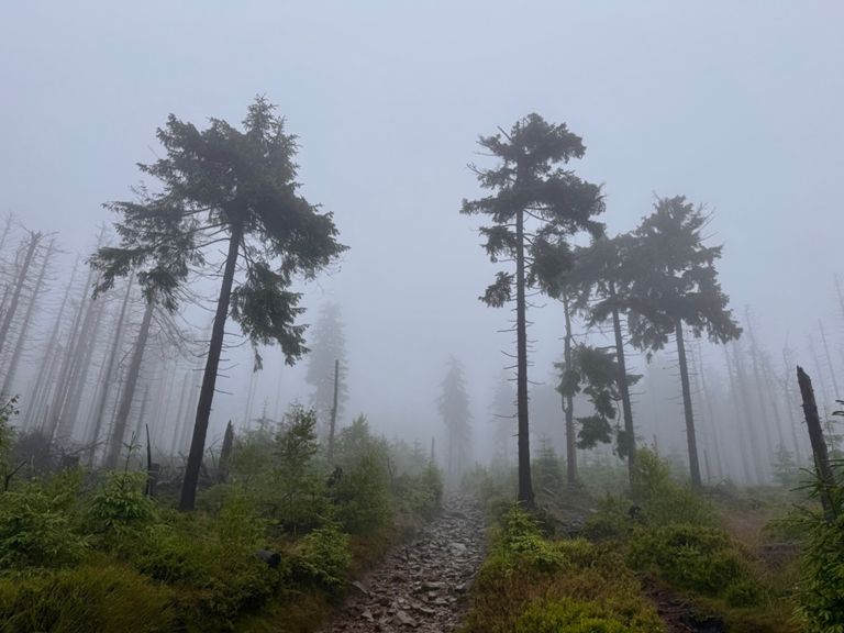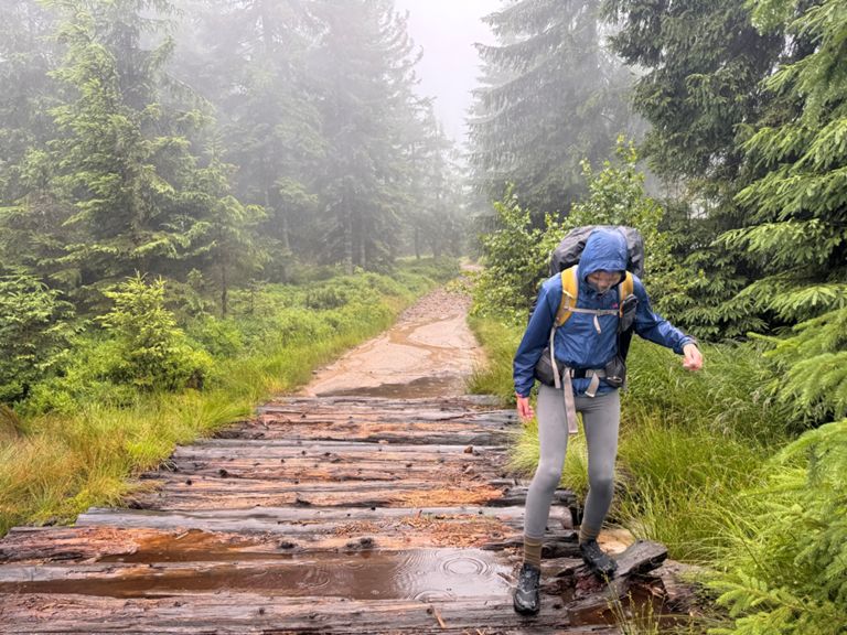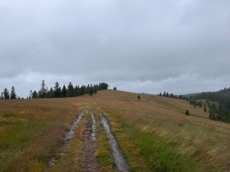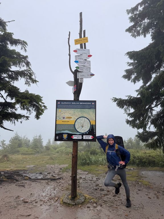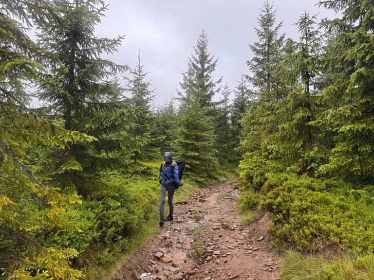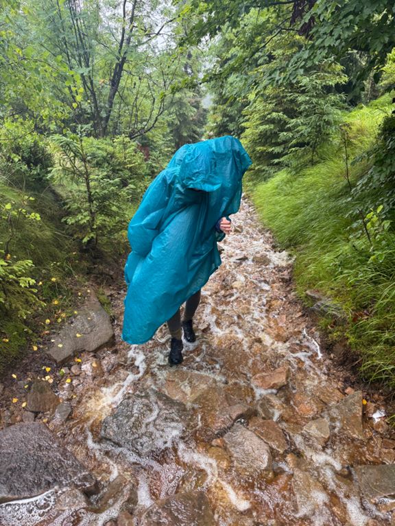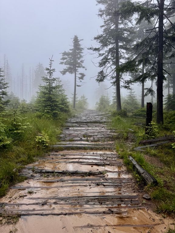 Extreme conditions. Heavy rain and strong wind turned the hiking trail up Barania Góra into a wild stream. Another path, paved with wood, was floating on the surface, with deep, rushing water in every direction. Still in good spirits, we sang loudly into the wind and fog, though at this point we were honestly afraid we might run into a bear. There was no way it could hear or smell us with the wind blowing like that. The whole day, there was nowhere to stop, rest or eat. Soaked to the bone, we finally made it to Węgierska Górka, to a nice room, and now we’re drying everything off.