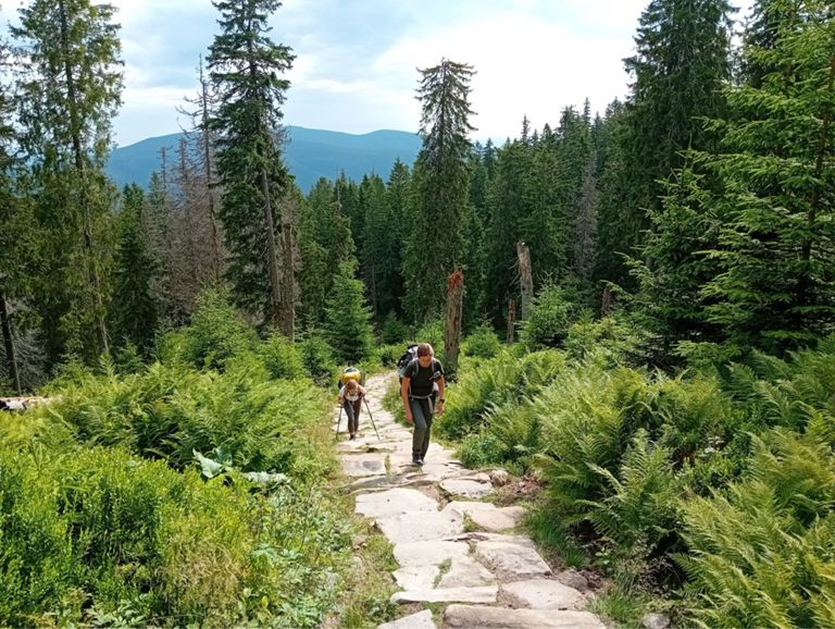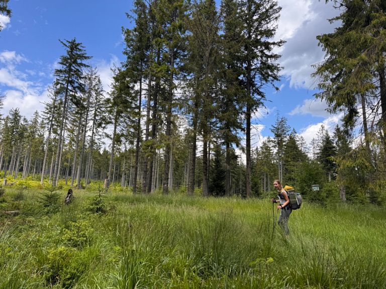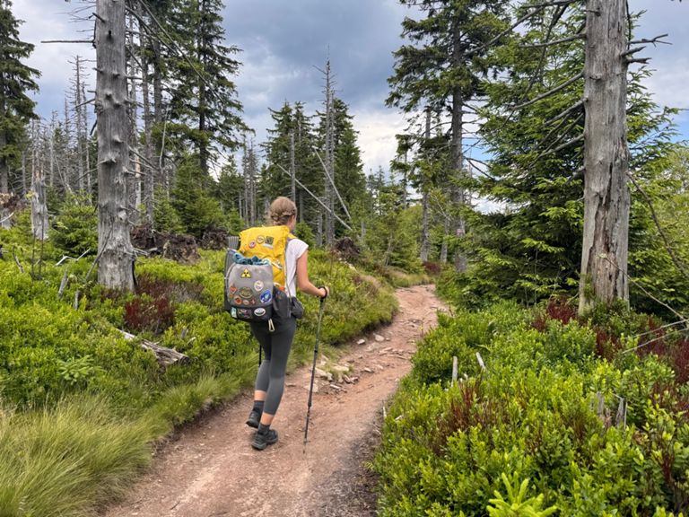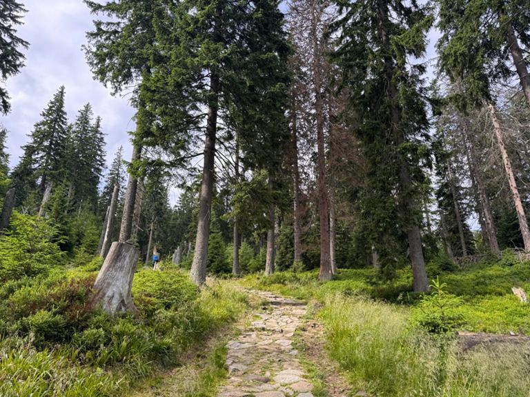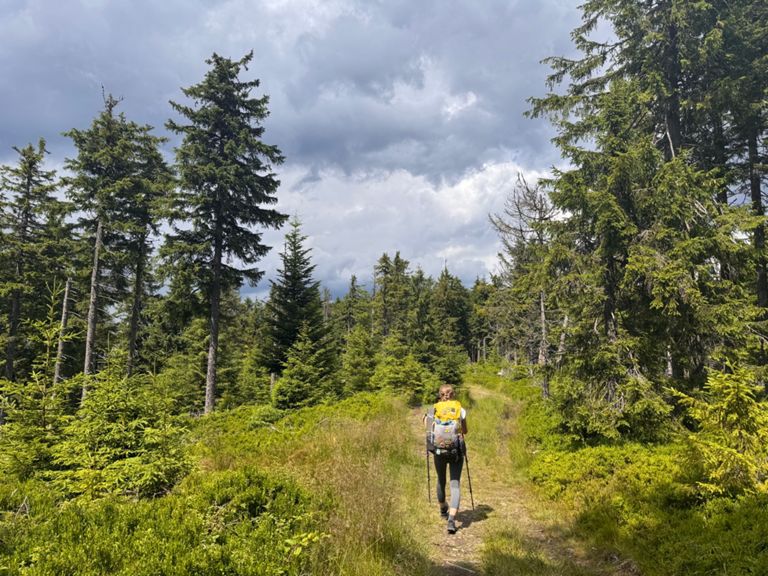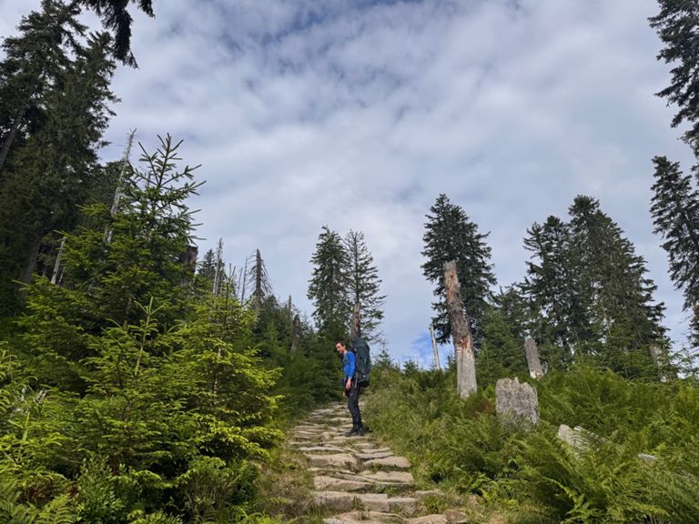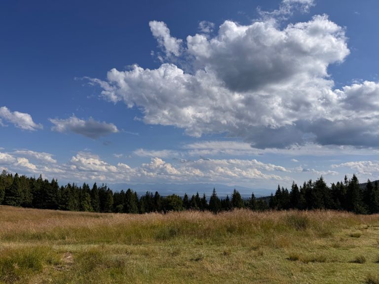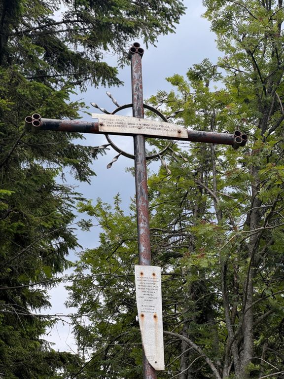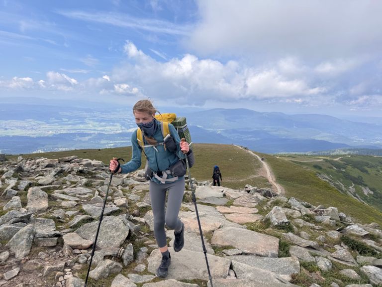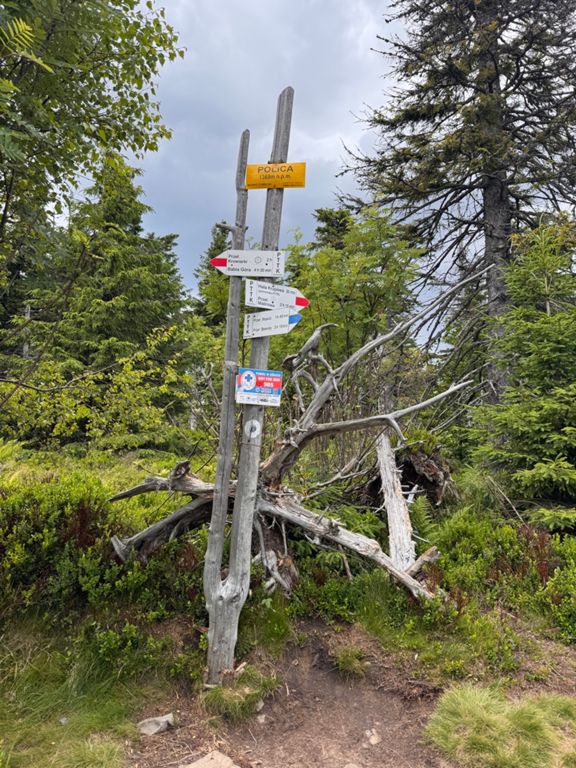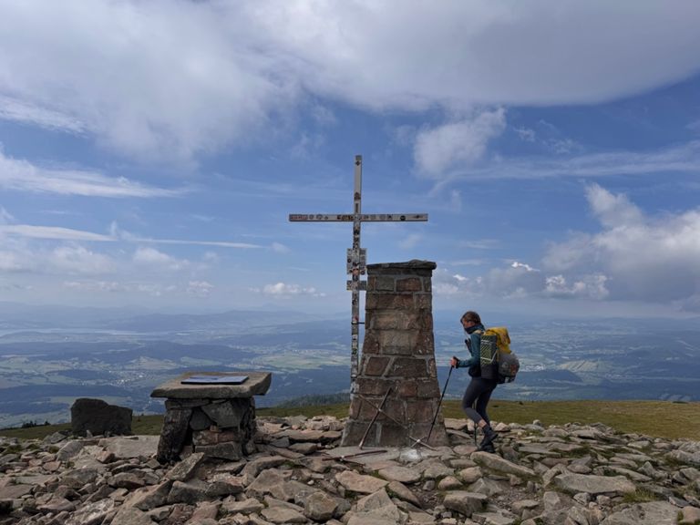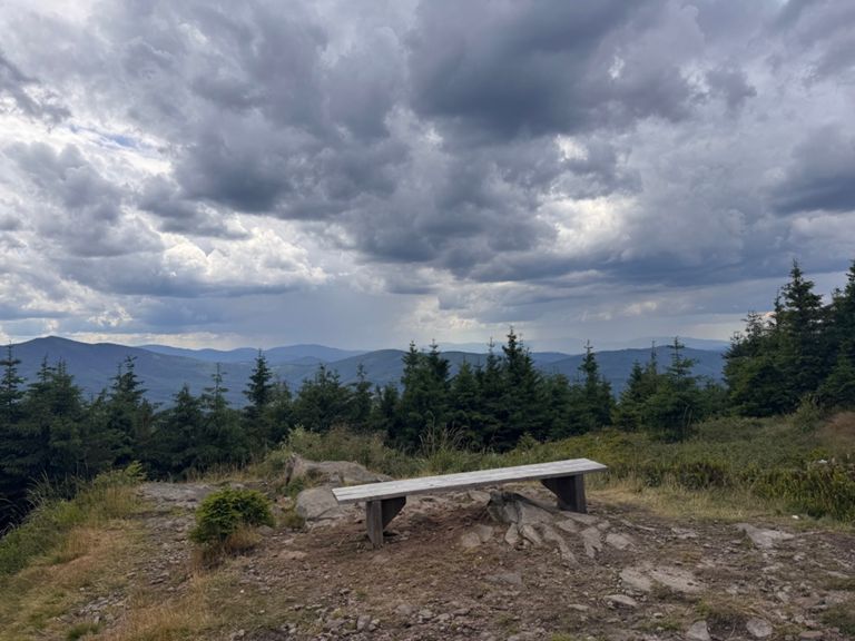We have conquered the highest peak of the entire trail, Babia Góra (1725 meters above sea level). A steep ascent, very strong wind, and an even steeper, endlessly long descent. While we were descending, literally hundreds, even thousands of hikers were streaming up from the parking lot on the edge of Babia Góra National Park. At the top, we said goodbye to Vojta, who headed towards the Slovak side, while our trail turned towards Poland. Anetka and I took a longer day and reached the first village where a proper storm began. But we are on our way to a rest day. We’re going to recover and gather new strength. Our first week in the mountains was tougher than we expected. But Anetka was very brave and kept a good mood all the time.