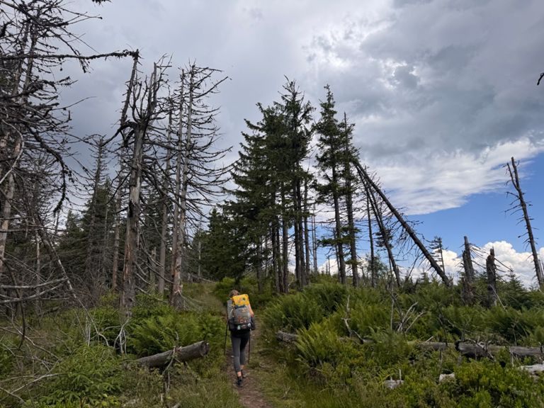 Najvyšší vrch celej trasy, Babia Hora (1725 m n. m.), máme za sebou. Strmý výstup, veľmi silný vietor a ešte strmší, nekonečne dlhý zostup. V čase, keď sme schádzali, sa hore valili doslova stovky až tisícky turistov z parkoviska na okraji Babiogorského parku narodowego. Hore sme sa rozlúčili s Vojtom, ktorý zamieril na slovenskú stranu, zatiaľ čo naša trasa sa odklonila do Poľska. S Anetkou sme si dali dlhší deň a došli až do prvej dediny, kde začala poriadna búrka. My sme ale na ceste za oddychovým dňom. Ideme regenerovať a nazbierať nové sily. Náš prvý týždeň na horách bol náročnejší, ako sme čakali. Anetka bola ale veľmi statočná a stále v dobrej nálade.