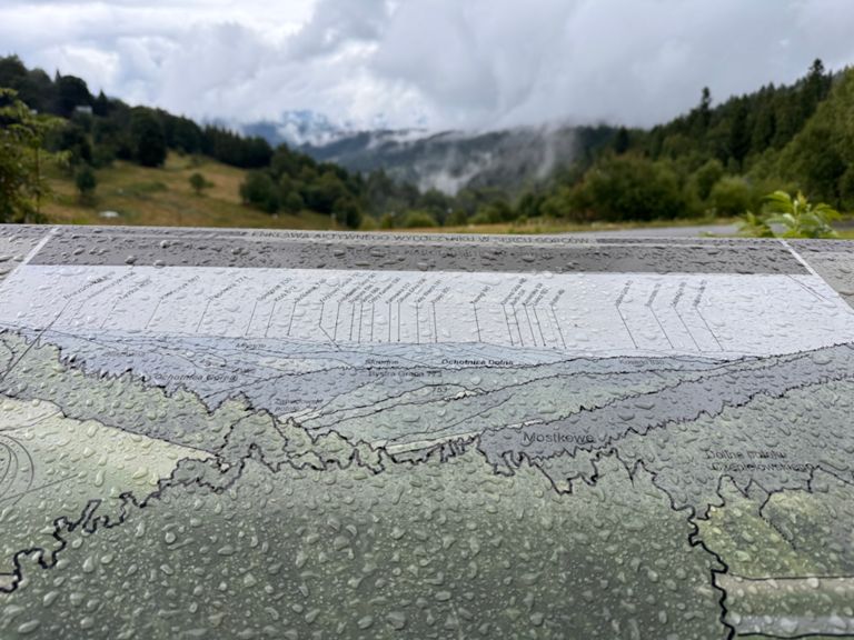 Celú noc lialo a málo aj celý deň. Nakoniec to nebolo až také zlé... len škoda ďalšej vyhliadkovej veže v hustej hmle. Navyše nám došlo jedlo, tak sme aspoň mali ľahšie batohy. Zaujímavosťou bola návšteva ďalšej bazy namiotovej (v mojom preklade basecamp), na veľmi peknom mieste pod vežou Lubań. Správcov campu sme podporili príspevkom (za kávu) a tým, že sme zobrali menšie vrece smetí dole do mesta (12 km). Asi hodinu sme posedeli a porozprávali sa, veľa sme sa dozvedeli aj o tom, ako tieto kempy fungujú. V meste Krościenko sme si konečne dali večeru a navštívili cukráreň ako z iného sveta (The Good Place).