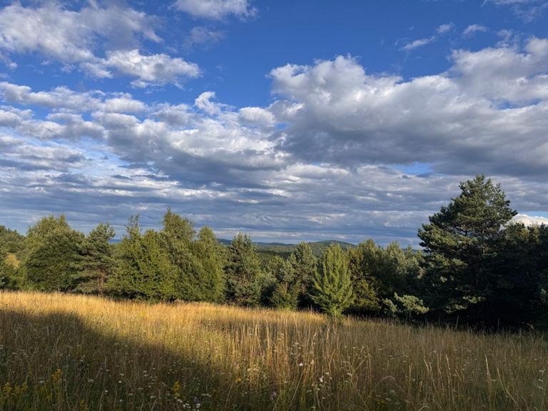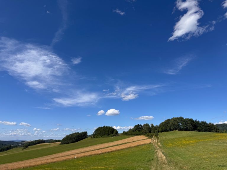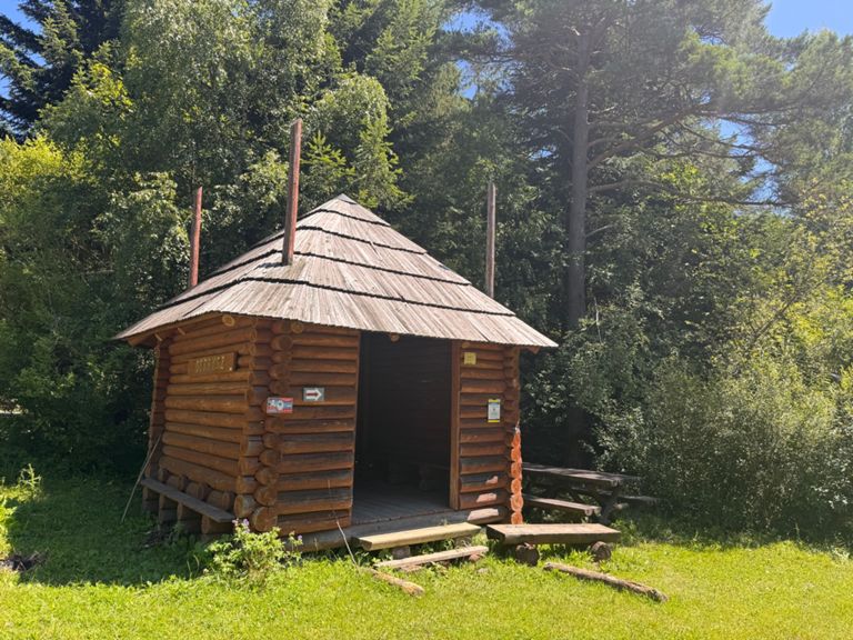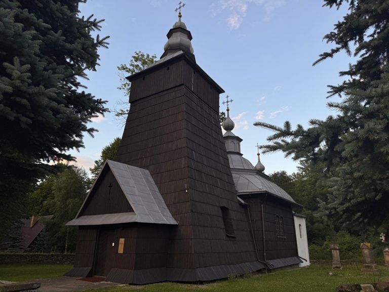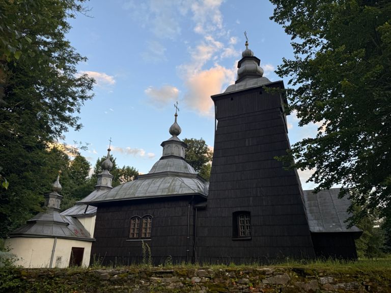 The day went by quite quickly, and I even ran around a bit when the horseflies started attacking. There was a lot of mud in the forest, but I’m told there’s some serious muck still to come, so hopefully not yet, because after my swamp experiences, I’d be disappointed. Jarek covered in mud showed up on his bike just as they brought pizza to my table - so he helped me out a bit with it. Good company. He was walking around, checking out soldiers’ cemeteries, symbolic gates to abandoned villages, and wooden churches. He showed me photos and told me about his experiences.