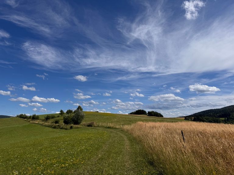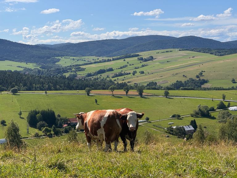 Deň celkom rýchlo zbehol, aj ja som chvíľami pobehla, keď začali útoky ovadov. V lese bolo veľa blata, ale vraj ma čaká ešte poriadne bahno, tak snáď to ešte nebolo ono, lebo by som bola po mojich skúsenostiach s močiariskami sklamaná. Zablatený Jarek sa na svojom bicykli objavil práve keď mi na stôl priniesli pizzu - tak s ňou trochu pomohol. Milá spoločnosť. Chodil po okolí, pozeral cintoríny vojakov, symbolické dvere do vysťahovaných dedín a drevené kostolíky. Ukazoval mi fotky a rozprával, čo zažil.