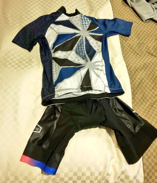 ジャージ、ビブ、インナー、アームウォーマー、レッグウォーマーを装着。