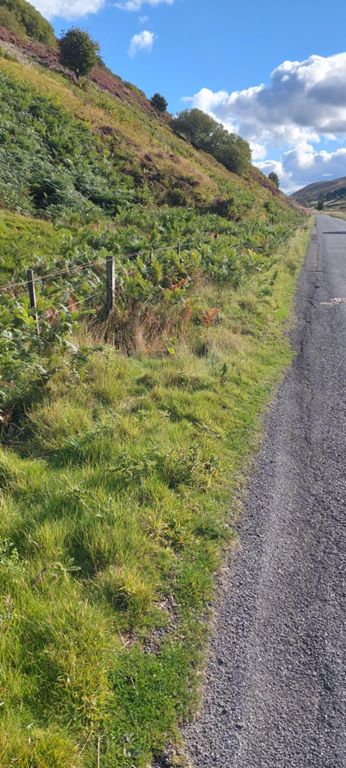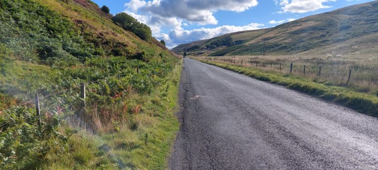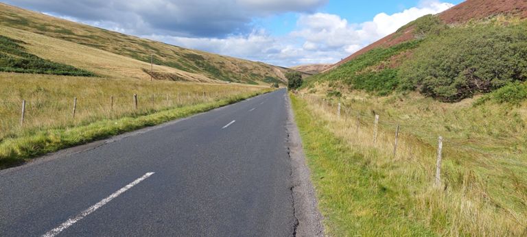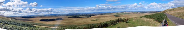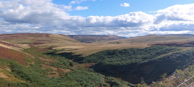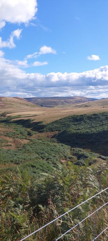Glorious gentle climb of 1315ft in Moorfoot Hills - gentle enough for me to climb faster than Lorraine - with super view back to the Forth and farmed land from halfway to Galashiels, then on the other side, a change of environment and land use.