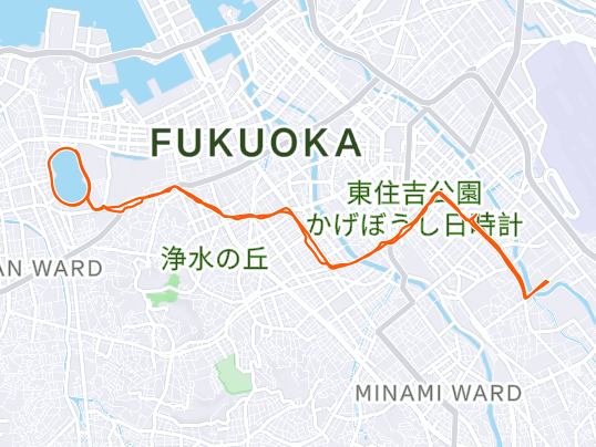 北海道マラソンの練習をするぞ!ということで、5'30"/Km ~ 6'00"/Km で 3 時間か 30 キロは行く予定が、まだ、足に霧えびの疲れが残っていたので大濠公園を 3 周で止めておいた。その後、余裕があるつもりだったけど、帰りは足が動かないのと、暑さでかなりバテてしまった。